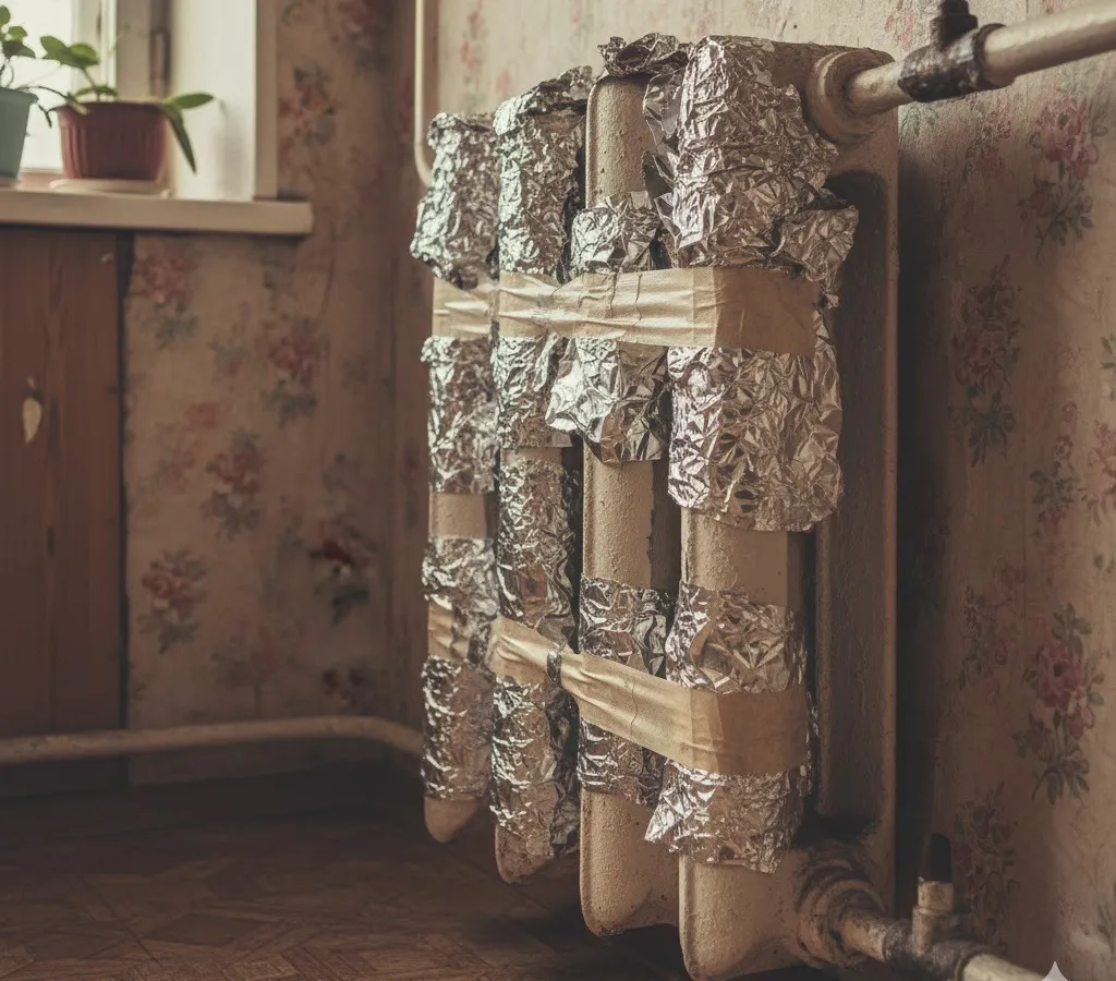 - Зазор — это важно: Между фольгой и задней поверхностью радиатора должно оставаться хотя бы 2–3 сантиметра пространства. Если наклеить фольгу вплотную к батарее, эффект отражения исчезнет, останется только теплопроводность.