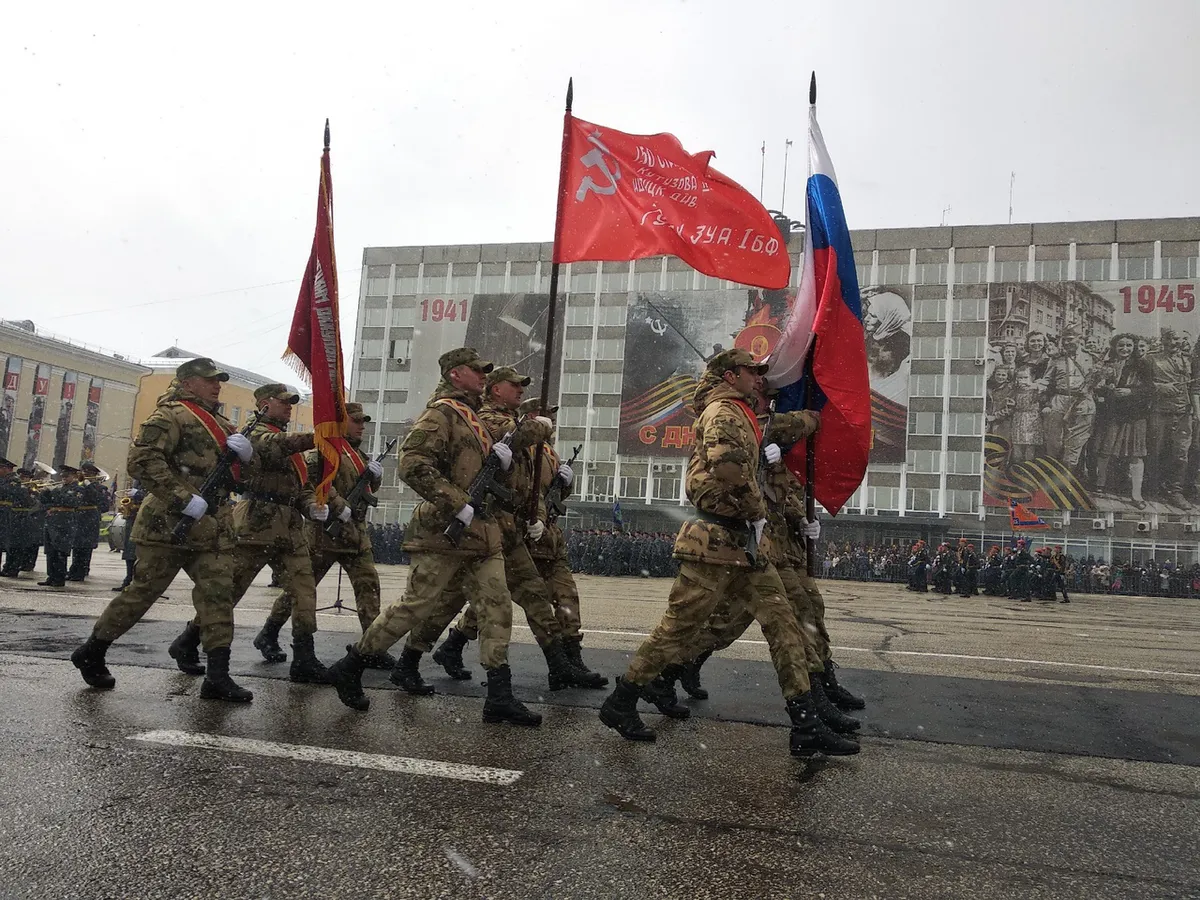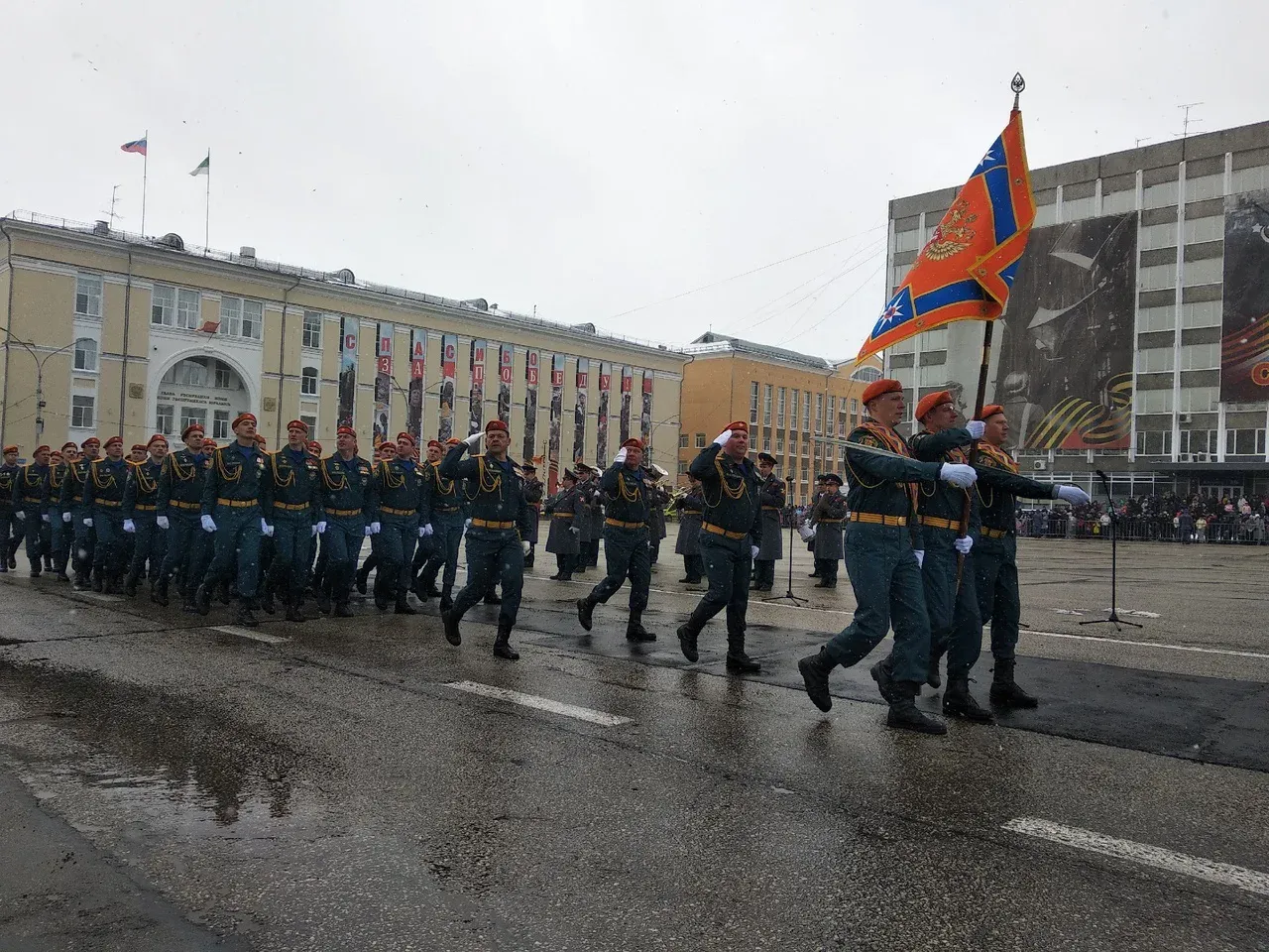 Когда парадные расчеты начали шествие, ненадолго выглянуло солнце. Сначала по площади под «Священную войну» торжественно пронесли флаг России, копию Знамени Победы и знамени 28й Невельской краснознаменной стрелковой дивизии.