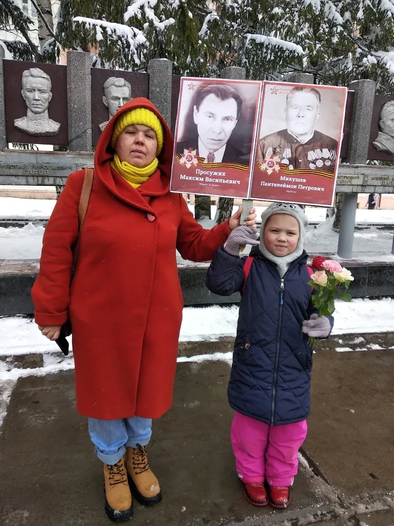 Ирина Шипиленко, педагог школы №1 города Сыктывкара, пришла на праздник со своей внучкой Алисой. Они принесли с собой портреты дедов и прадедов - фронтовиков.