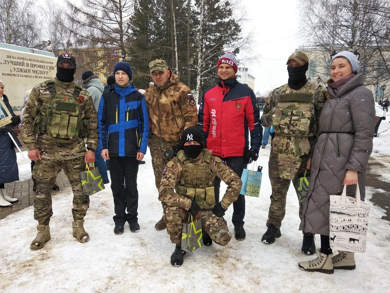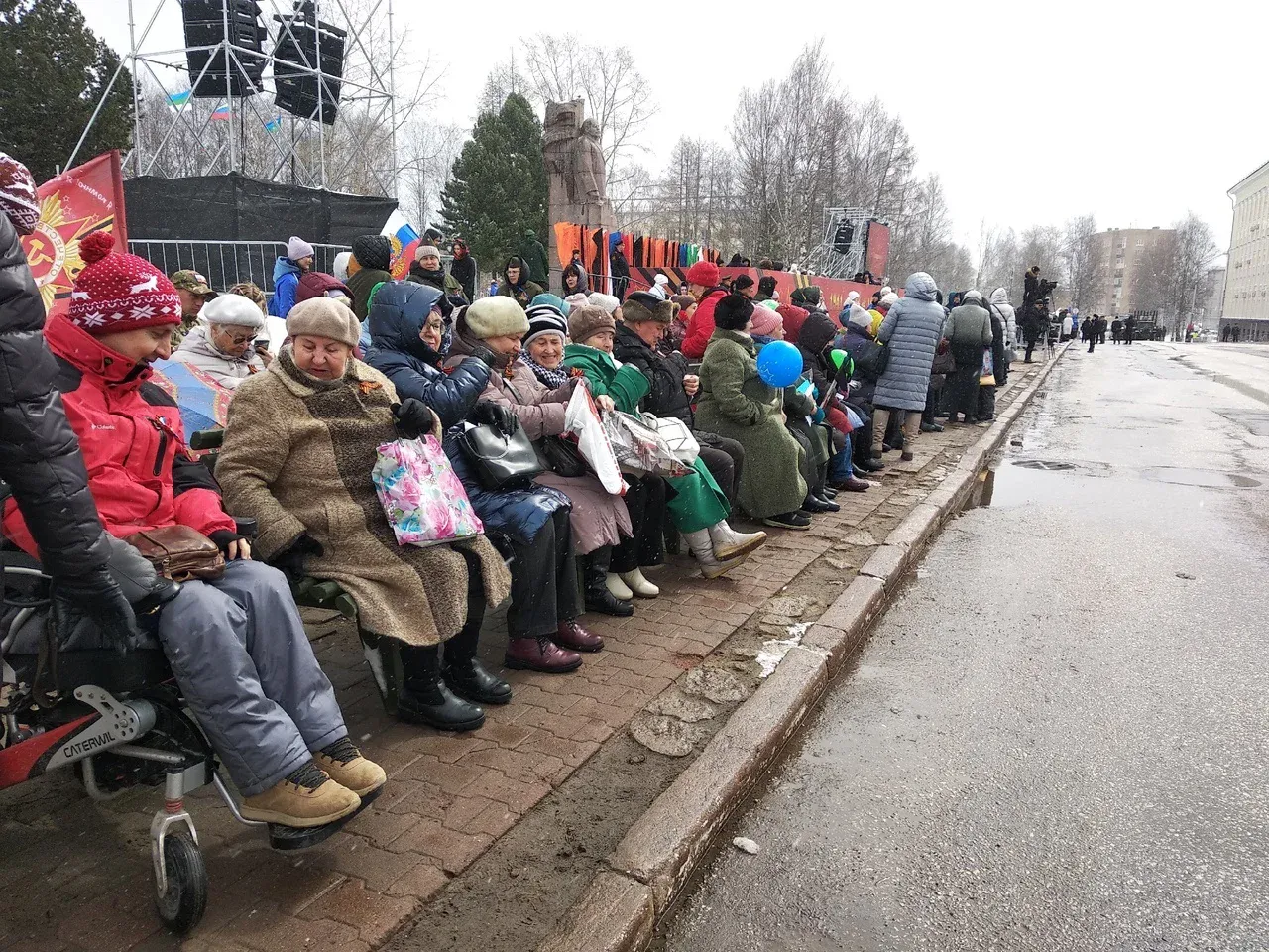 Несмотря на снег, слякоть и пронизывающий ветер сыктывкарцы начали собираться у площади за час до начала парада. Некоторые несли в руках красные гвоздики и таблички с портретами дедушек или отцов, участвовавших в Великой Отечественной Войне. Дети войны, труженики тыла, ветераны ВОВ и участники СВО наблюдали за парадными расчетами, сидя на скамейках у трибуны.