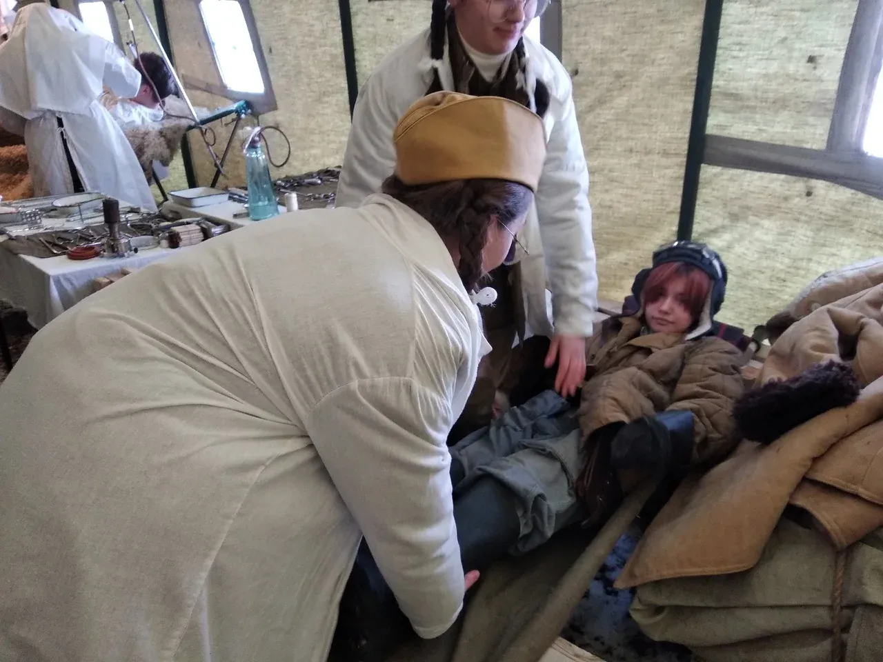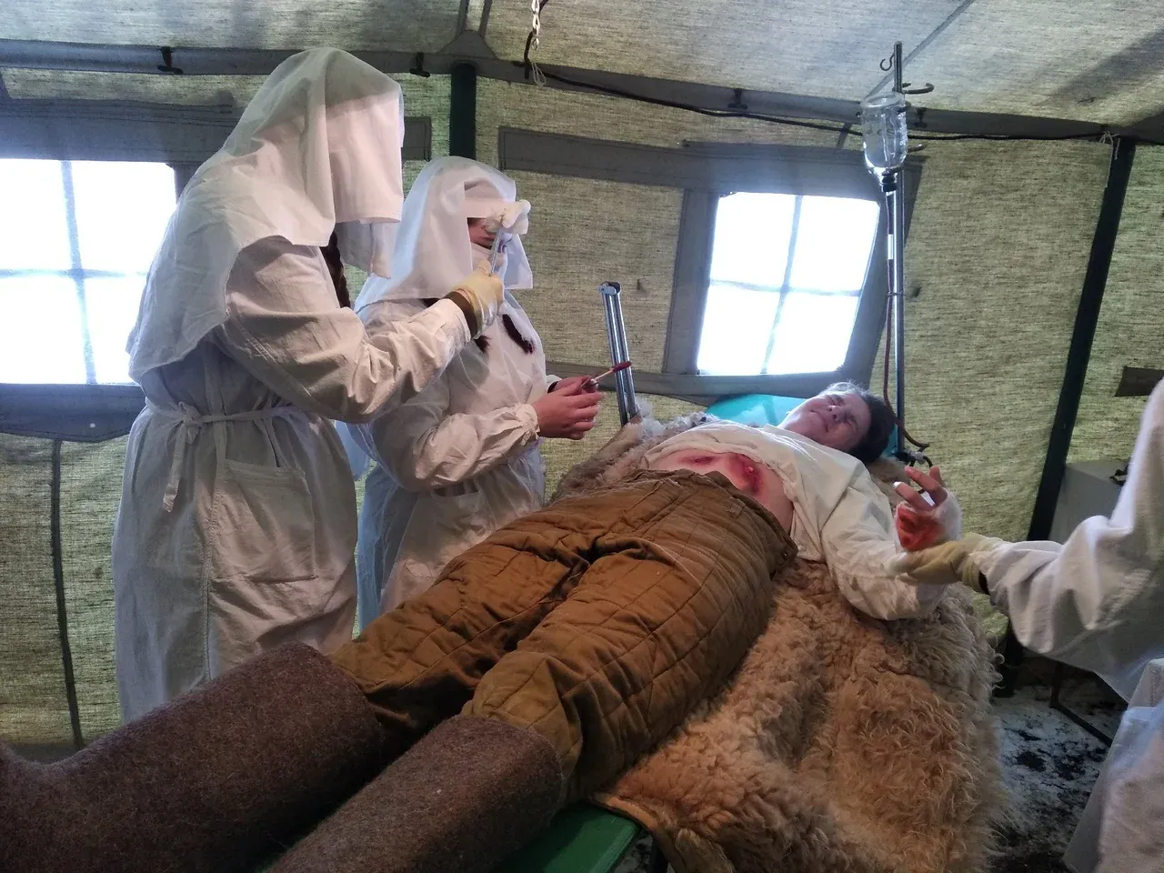 Недалеко развернулся полевой госпиталь, где студенты медицинских учебных заведений Сыктывкара спасали раненых, которых подвозили - притаскивали с поля боя санитары. Тут же делали операции, извлекали осколки и пули из раненых солдат, зашивали и забинтовывали.