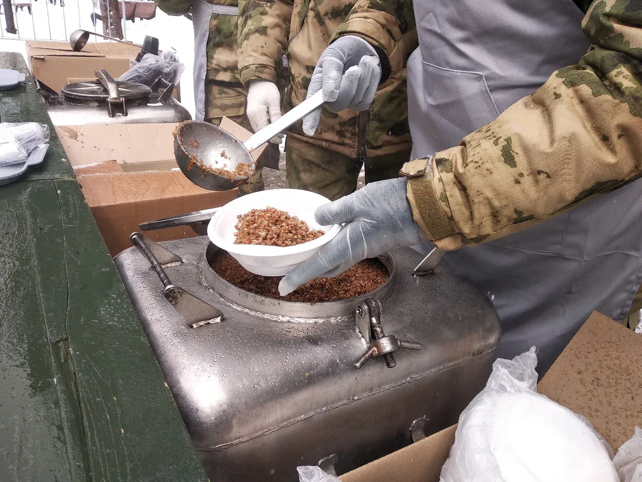 После парада начали работать праздничные площадки. Так, ветеранов угостили кашей на полевой кухне.