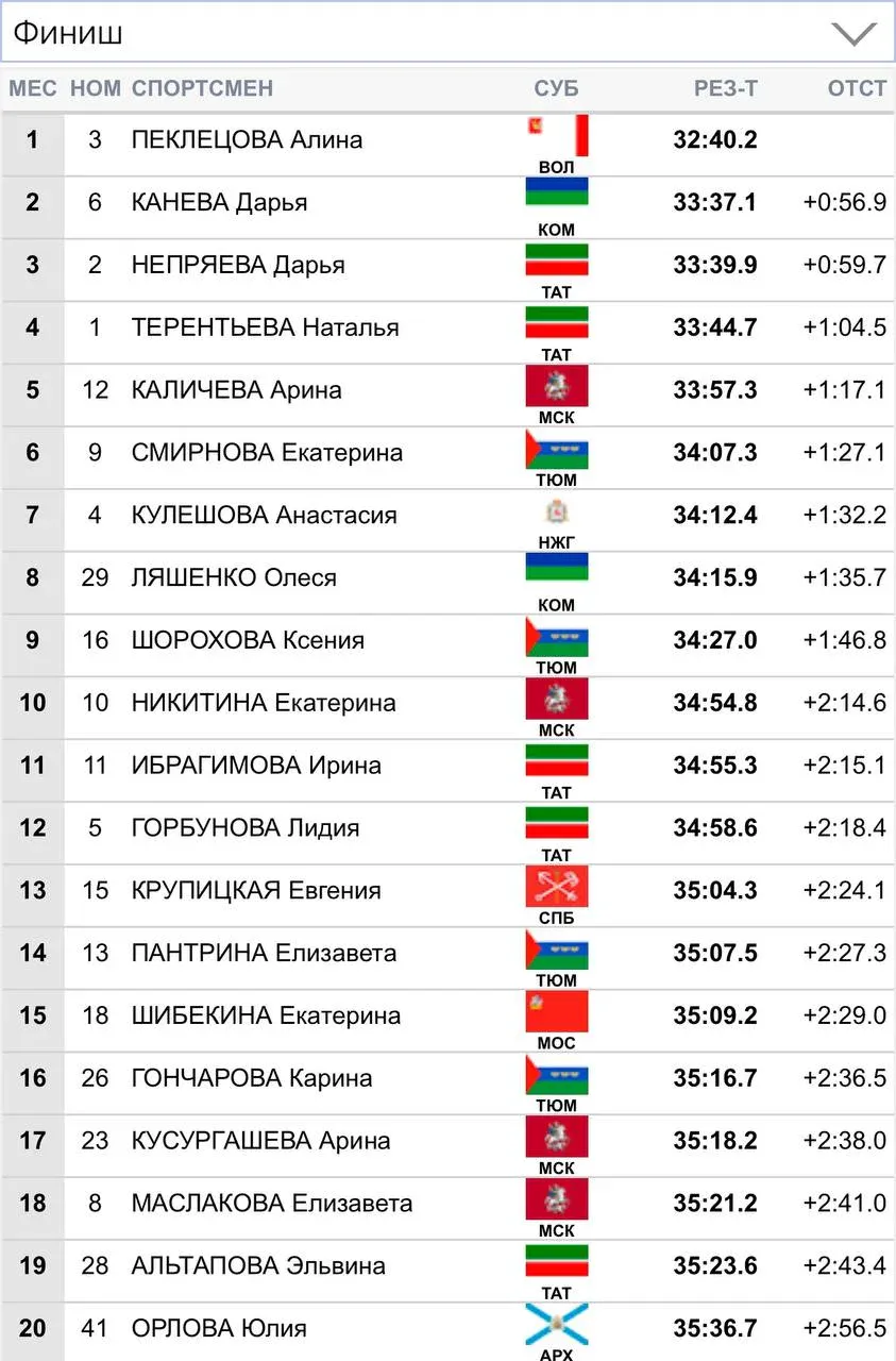 Среди женщин победу одержала Алина Пеклецова из Вологодской области, известная как “царица горы” прошлого сезона. Однако, лыжница из Коми, Дарья Канева, показала отличный результат, финишировав второй с отставанием от победительницы в 56.9 секунд. Третье место заняла Дарья Непряева из Татарстана, отстав от лидера на 59.7 секунды. Стоит отметить, что еще одна представительница Коми, Олеся Ляшенко, заняла восьмое место.