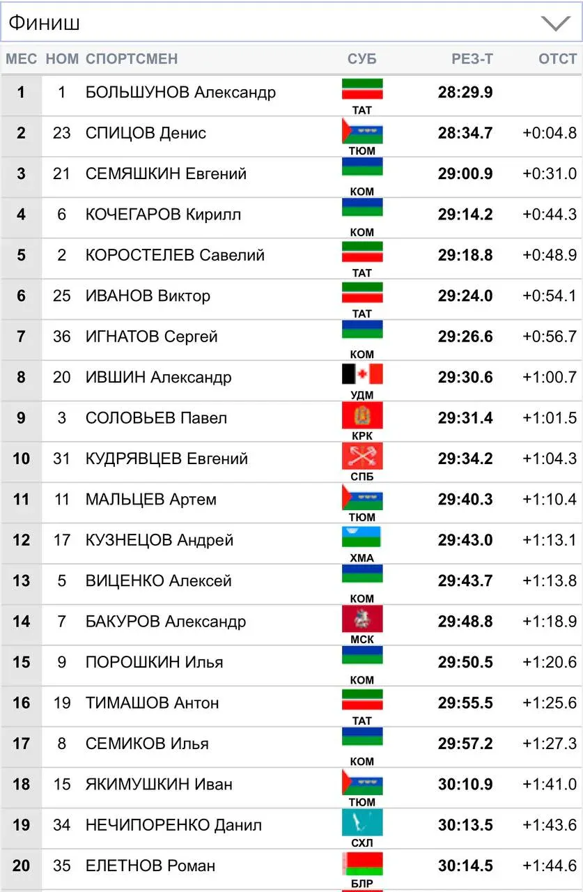 В мужском забеге первым на вершину забрался Александр Большунов. Второе место занял Денис Спицов. Лыжник из Коми, Евгений Семяшкин, также продемонстрировал высокий уровень подготовки, финишировав третьим. Кроме того, еще один представитель республики, Кирилл Кочегаров, занял четвертую позицию, а Сергей Игнатов финишировал седьмым.