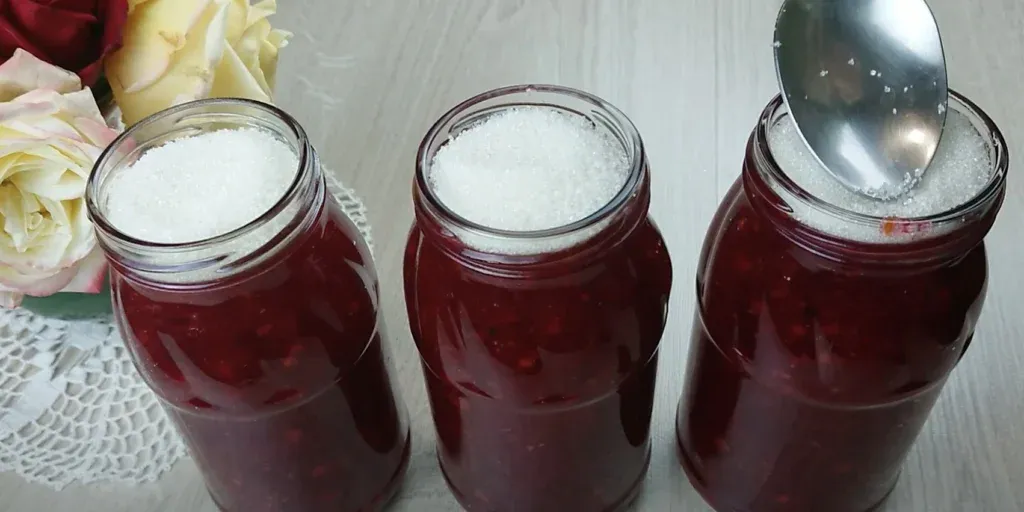 4. Разлейте пюре по стерилизованным банкам, сверху посыпьте сахаром (1 см) для продления свежести, и закройте крышками. Храните в холодильнике.