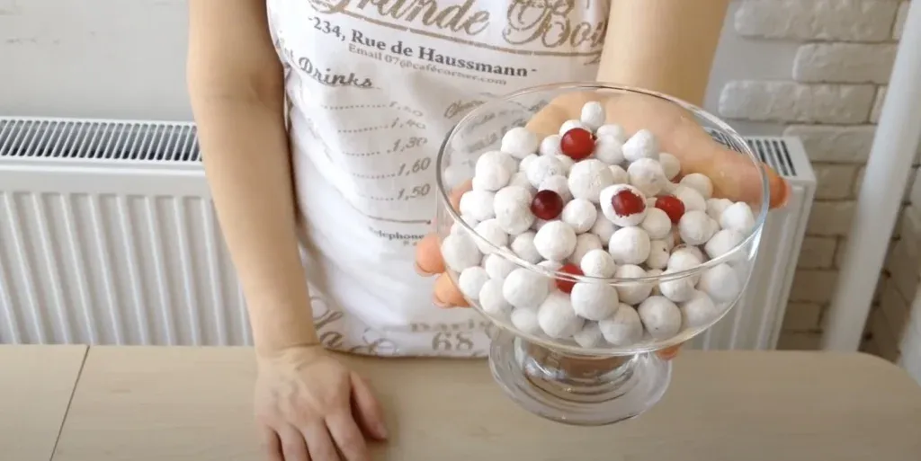 4. В глубокую тарелку насыпьте сахарную пудру и по порциям добавляйте клюкву, обваливая её в пудре.