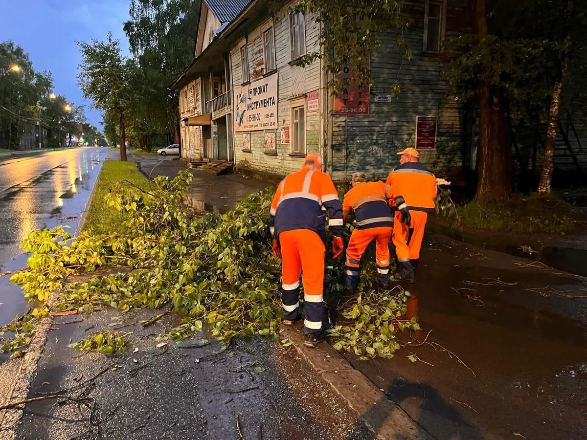 В Сыктывкаре продолжаются работы по ликвидации последствий ночной грозы, которая принесла сильный ветер и ливень.