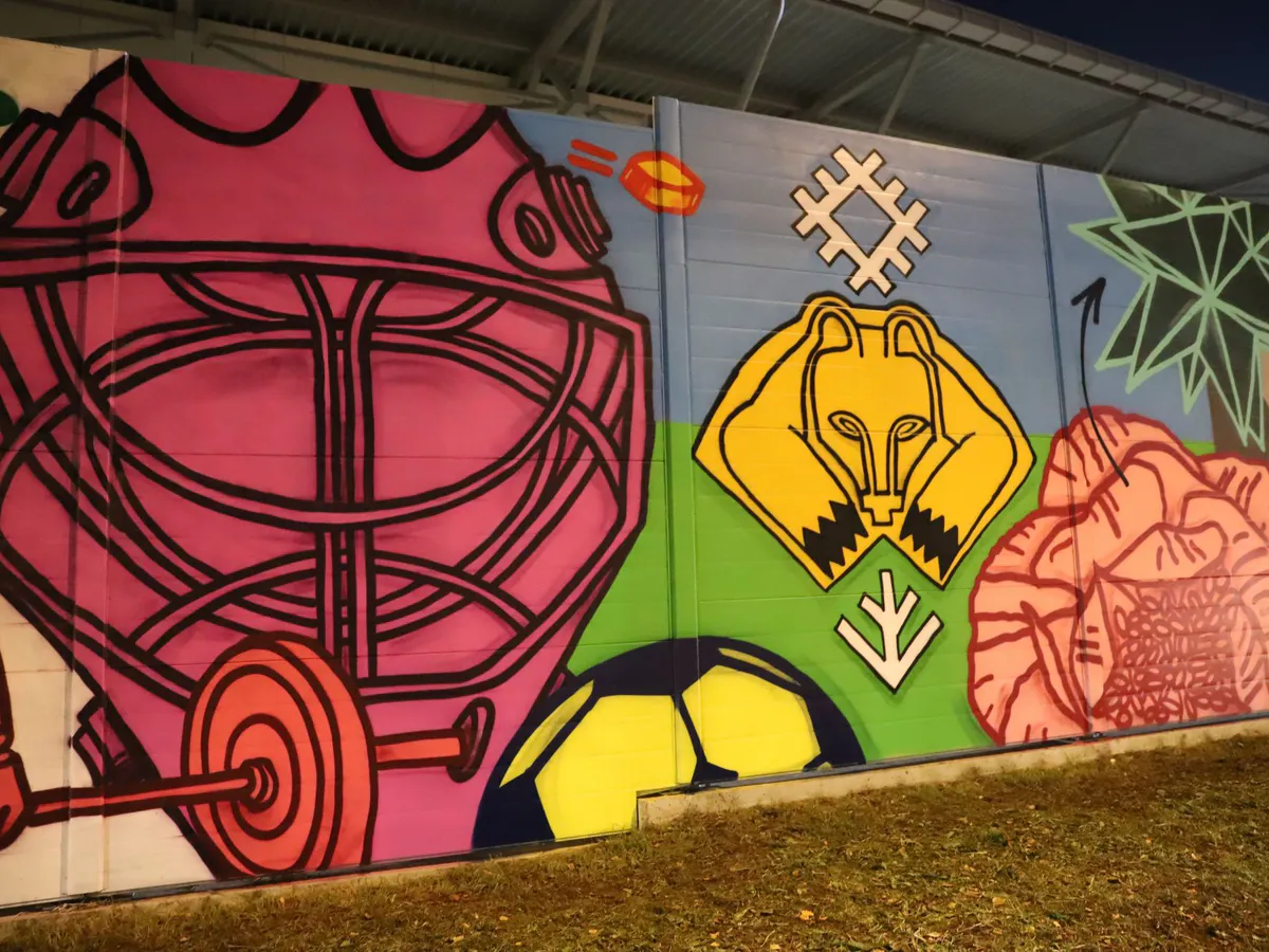 Яркое произведение украсило шумоизоляционное ограждение Центрального стадиона города.