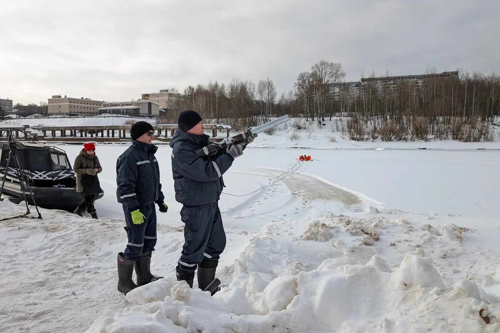 В Сыктывкаре учения проходили на берегу Сысолы рядом с поселком Заречье. Первая вводная - в единую дежурную диспетчерскую службу столицы республики поступил сигнал - на Сысоле в полынью провалился зазевавшийся рыбак. На место тут же прибыли спасатели дежурной смены сыктывкарского аварийно -спасательного отряда.