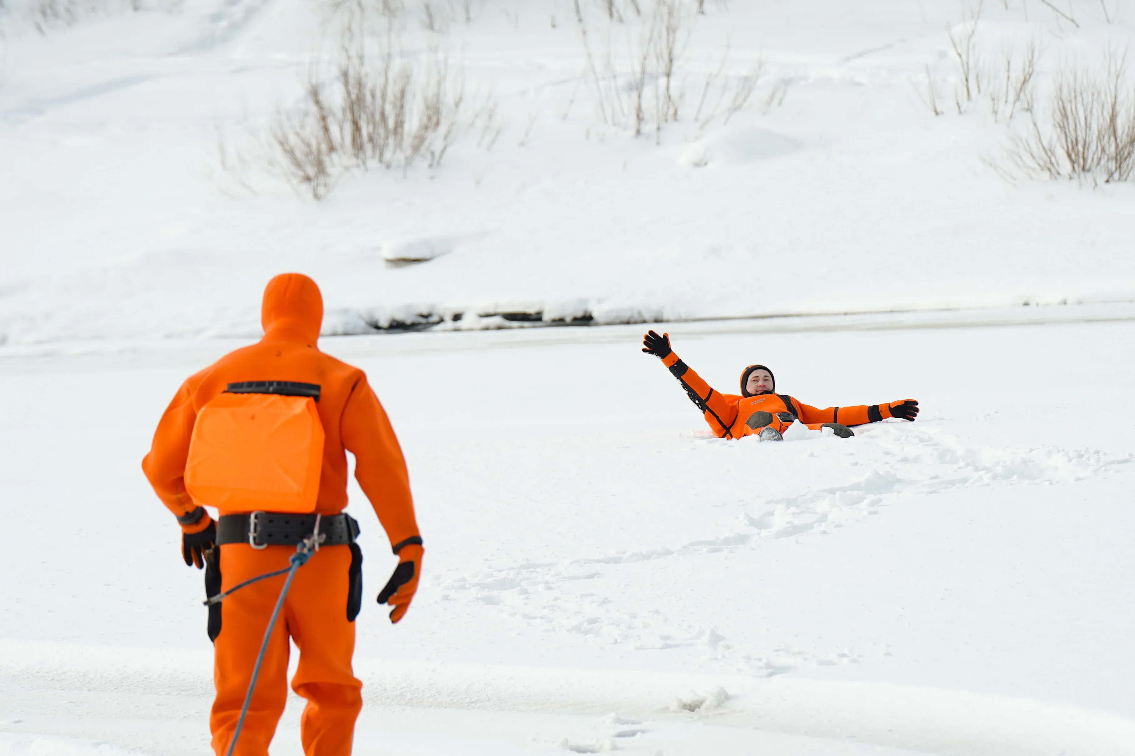 Попавшему в беду рыбаку тут же закинули спасательный конец Александрова (Представляет собой плавучий тонкий корабельный трос длиной около 30 метров, с петлёй диаметром около 40 сантиметров и двумя поплавками ярко-оранжевого цвета.) и попросили продержаться несколько минут. За это время приготовили спасательный надувной трап. Вооружившись трапом спасатели ползком добрались до утопающего и успешно вытащили его на берег.