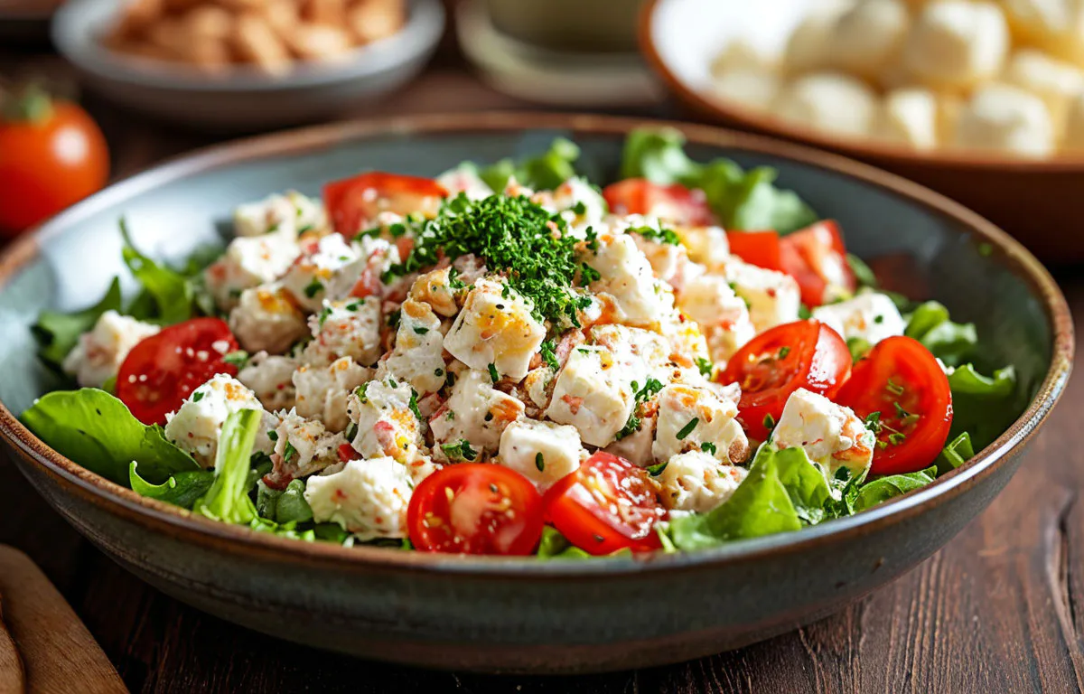 Предлагаю вам обновлённую и уникальную версию этого аппетитного рецепта салата с крабовыми палочками, свежими томатами и ароматным сыром. Это лёгкое, но в то же время насыщенное блюдо станет отличным вариантом как для семейного обеда, так и для быстрого перекуса.