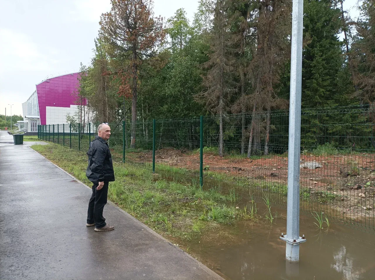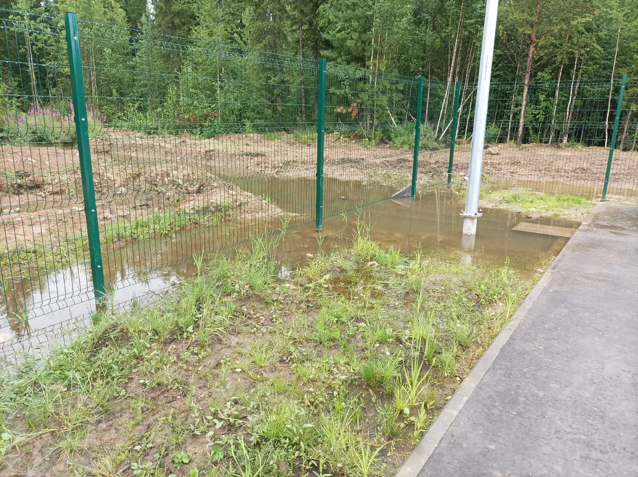 Одной из главных проблем стала система водоотведения. Вместо полноценного решения вопроса с канализацией, вдоль пешеходной дорожки была вырыта канава, которая заканчивается в лесной зоне небольшим котлованом без водоотвода. Первые большие ливни уже показали недостаточность такого решения.