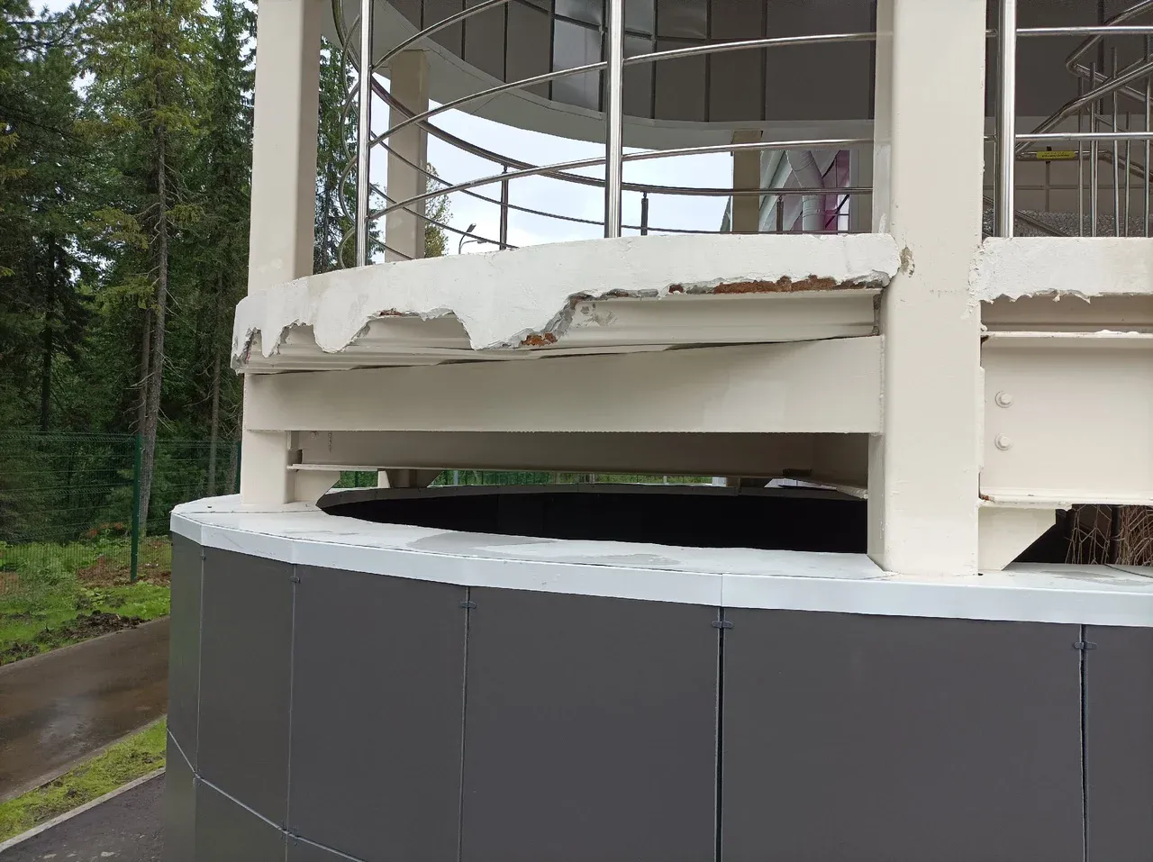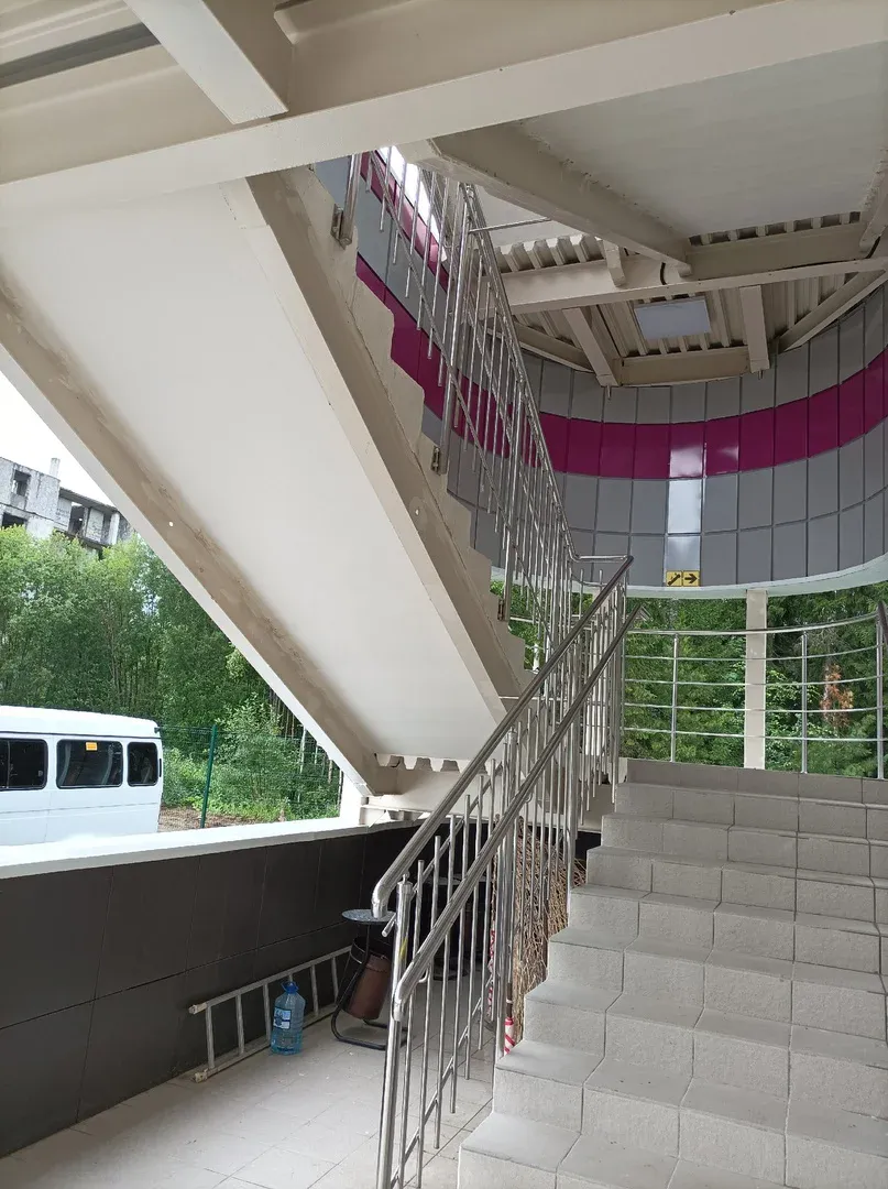 Лестничные марши на второй этаж по проекту не закрыты от попадания осадков, поэтому дождем там залито всё. По таким скользким лестницам передвигаться крайне опасно.