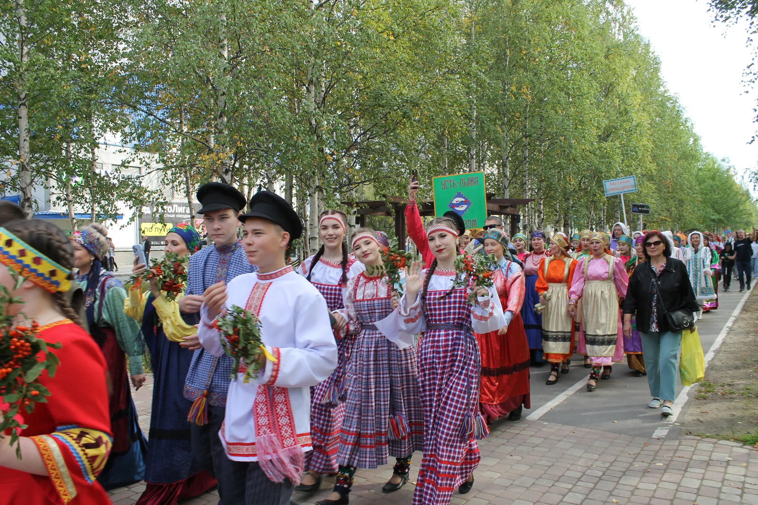 Шествие в национальных костюмах заполнило улицу Молодежную, создавая незабываемое зрелище. Участники из Усинского округа и делегации из Печоры, Инты и Сыктывкара продемонстрировали многообразие культурного наследия народа коми.