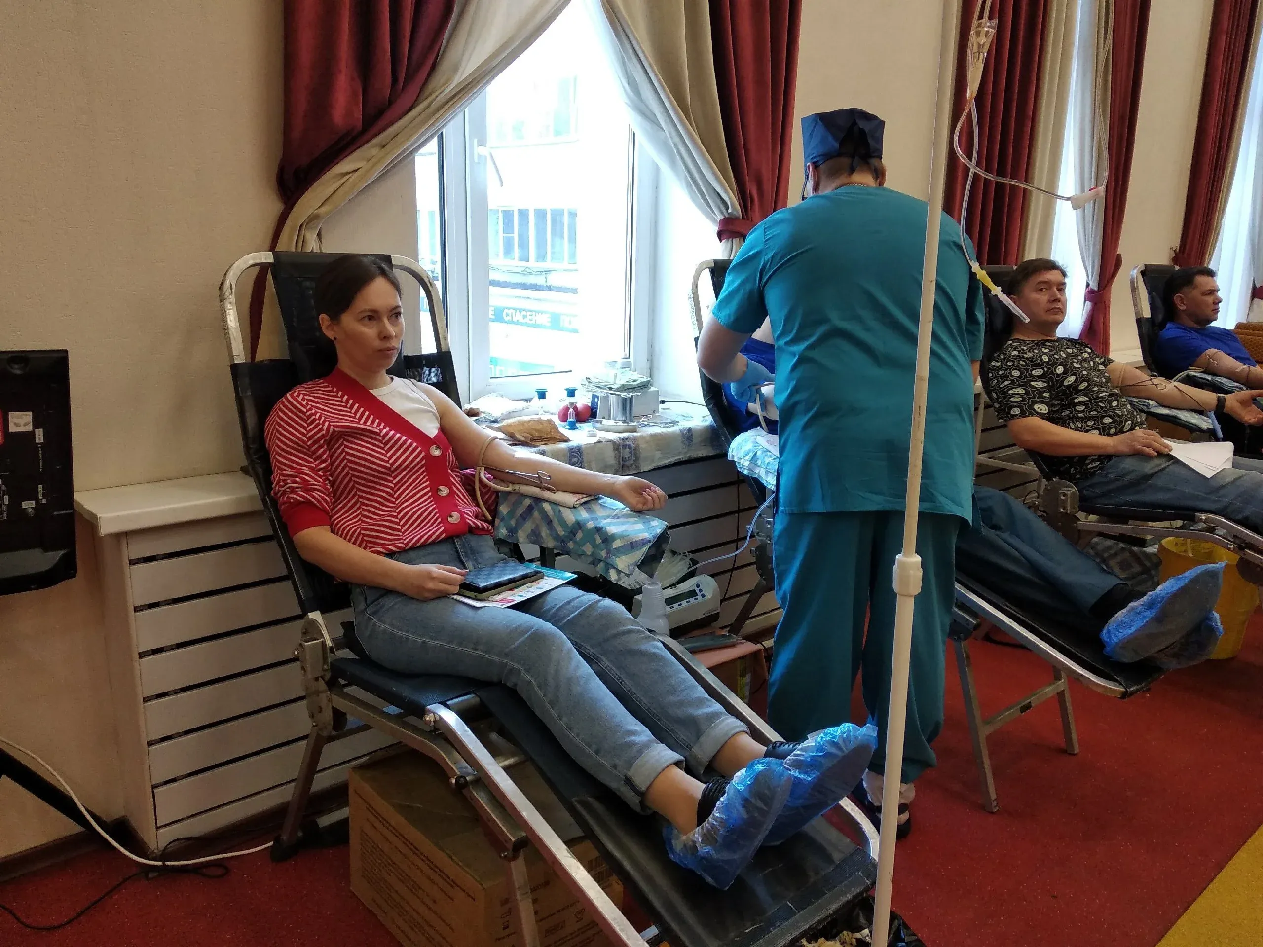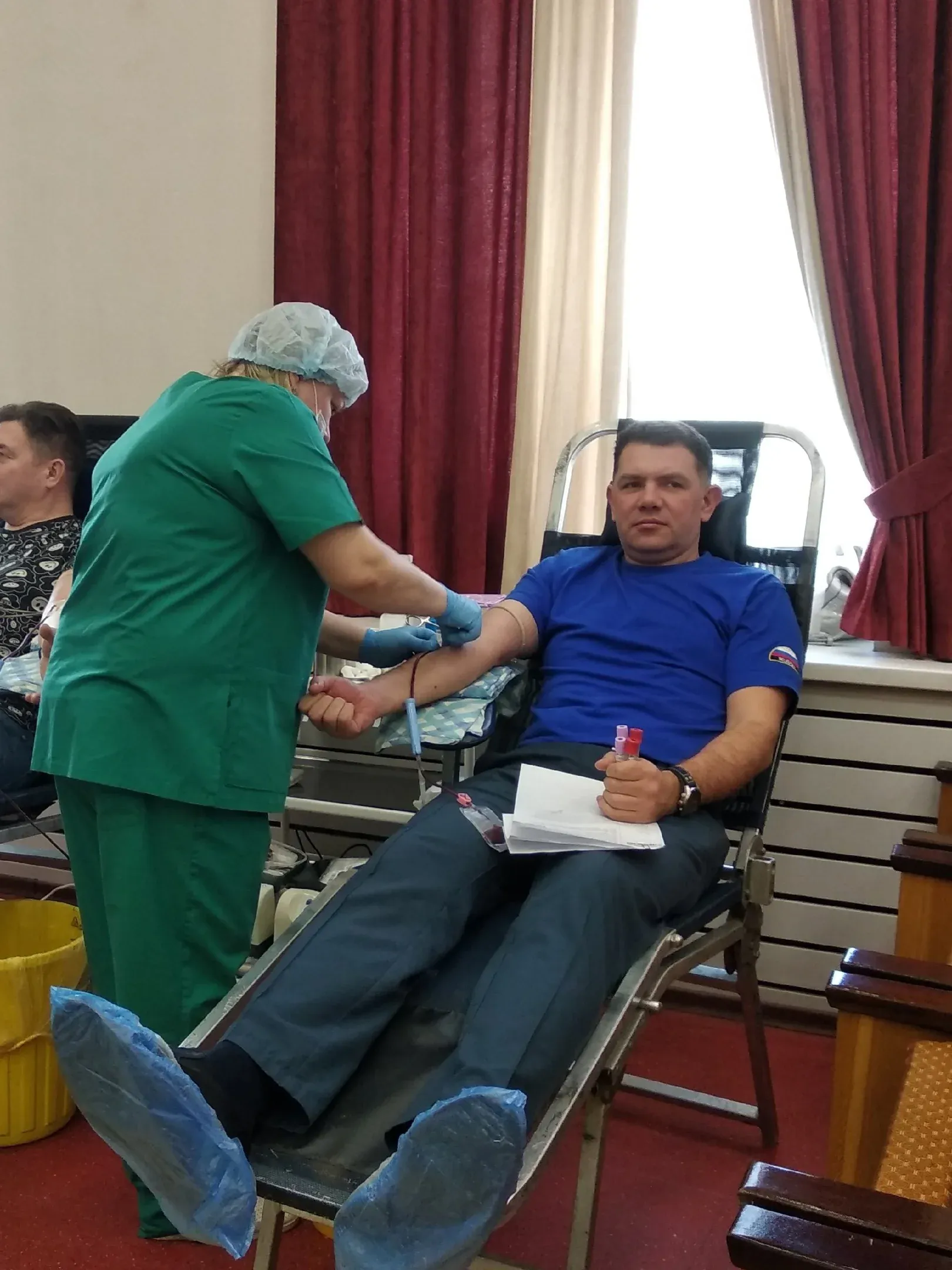 Я сегодня диету соблюдал, даже кофе не пил, хотя я кофе очень люблю. Пил сладкий чай. Самочувствие отличное. Сколько раз сдал кровь - я не считал, но раз в полгода я участвую в донорстве. Я уже 36 лет на службе - вот и считайте. Наши сотрудники постоянно сдают кровь, оказываем помощь и в этом. У нас организовано взаимодействие со станцией переливания крови, если требуется кровь - мы оперативно с сотрудниками приезжаем на станцию и сдаем. В этом году 30 апреля будем отмечать юбилей - 375 лет пожарной охране России, поэтому акция сегодняшняя еще и этой дате посвящена.