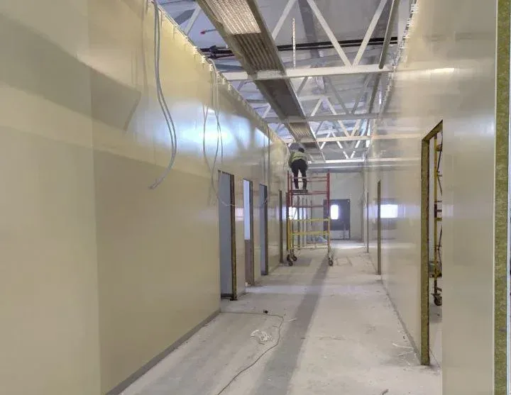 На сегодняшний день строители перешли к внутренним работам. На объекте монтируют межкомнатные перегородки, устанавливают дверные блоки, прокладывают электропроводку и налаживают систему пожарно-охранной сигнализации. Параллельно ведется оснащение будущего отделения высокотехнологичным оборудованием.