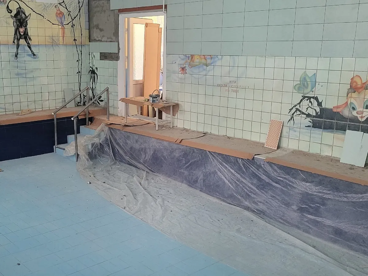 Специалисты проводят штукатурно-малярные работы в залах, частично заменяют плитку в детском бассейне и мужской душевой, обновляют шкафы в раздевалках и ремонтируют сауну.
