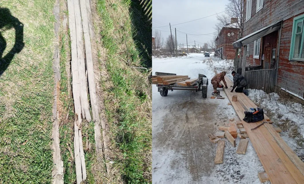 Женщина, имеющая инвалидность по зрению, проживает в многоквартирном деревянном доме. Она сообщила, что крыльцо и деревянные настилы на придомовой территории полностью пришли в негодность — доски сгнили и разрушились.
