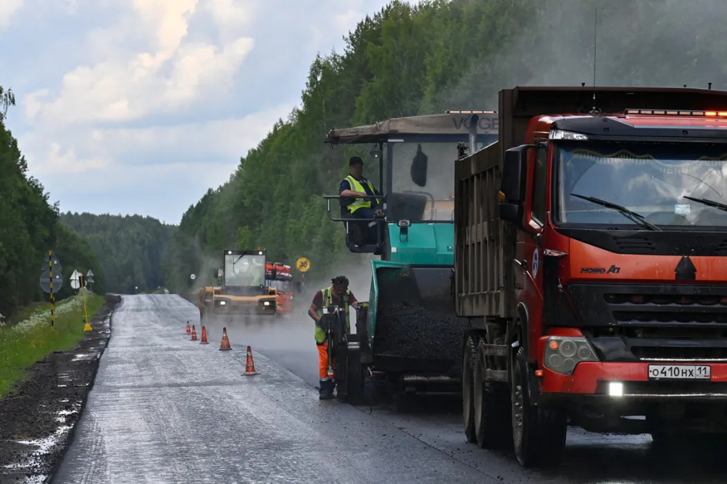 Начальник Сысольского дорожного ремонтно-строительного управления АО “Коми дорожная компания” Роман Чаланов доложил, что на участке с 25-го по 38-й километр трассы уже полностью завершено устройство нижнего слоя покрытия, а также выполнено 6 километров верхнего слоя.