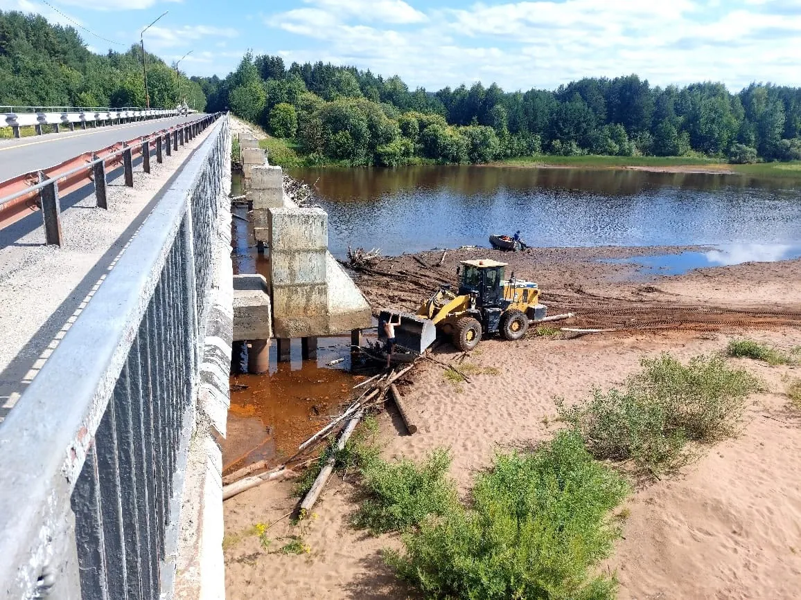 Проблема скопления древесных материалов вблизи опор моста на автомобильной дороге из Койдина до административного центра была выявлена в ходе мониторинга водных объектов и по обращениям граждан. Данное явление возникло из-за естественных процессов перемещения древесины во время паводков и половодья.