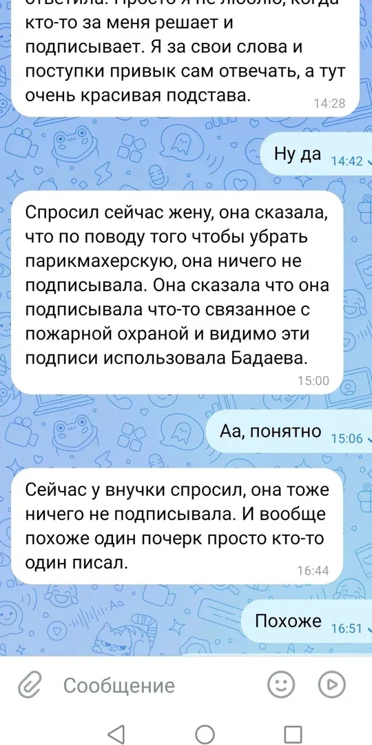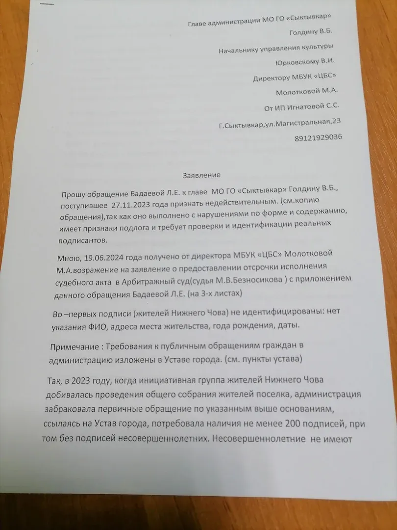 Светлана Игнатова уверена, что обращение с просьбой о возврате помещения под крыло библиотеки сфабриковано конкурентами. Подписи под обращением, считает предприниматель, сфальсифицированы. Игнатова выяснила, общаясь с якобы подписантами, что никто из них свою подпись под обращением не ставил. То - есть, закорючки за них попросту поставил кто-то другой. Это она выяснла врезультате общения с жителями поселка, якобы подписантами.