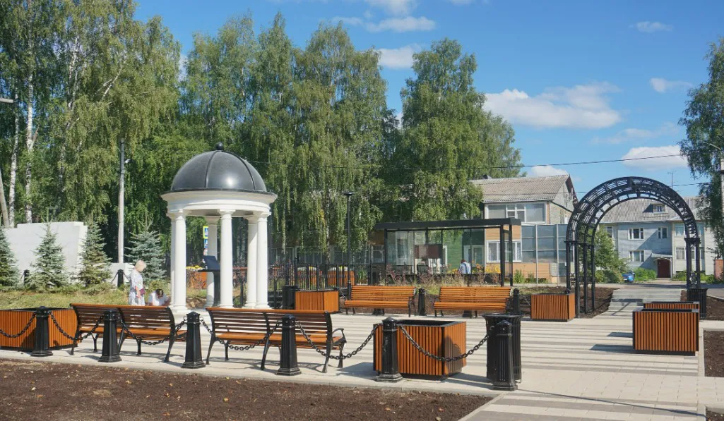 На территории уже установлены ключевые элементы: декоративная ротонда, изящный мостик, пергола, новые скамейки, урны и вазоны для цветочных композиций. Для удобства посетителей проложены аккуратные дорожки и смонтирована система дополнительного освещения.