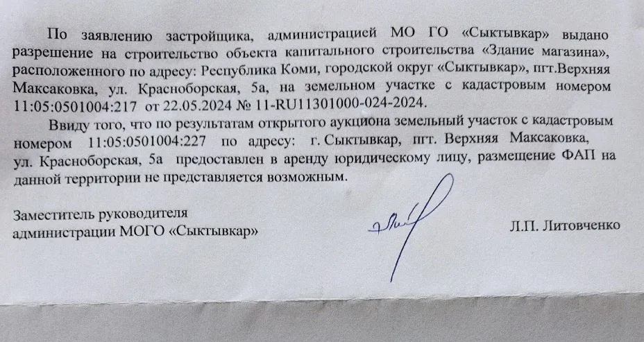 Как следует из ответа администрации города, разрешение на строительство получено только в конце мая. А строительство началось значительно раньше и прокуратура Сыктывкара не считает это нарушением закона. У меня есть большие сомнения в честности чиновников, сопричастным к выделению земельного участка. А про то что интересы людей, их права выше прав коммерческих лиц, Голдиным(мэр Сыктывкара) и чиновниками города не принимается во внимание. Никто не убедит меня в том что здесь нет коррупционной составляющей. Жителям поселка нужна амбулатория в удобном месте. Коммерсантам нужна прибыль за счёт нарушения прав людей. У меня есть предложение разместить в этом строении амбулаторию и магазин. Комерс должен знать что есть божий суд и его не купить как некую администрацию и чиновников у руля власти. Пора коммерсанту понять что есть социальная справедливость и интересы и права граждан важнее для государства и общества,чем прибыль частного предпринимателя.