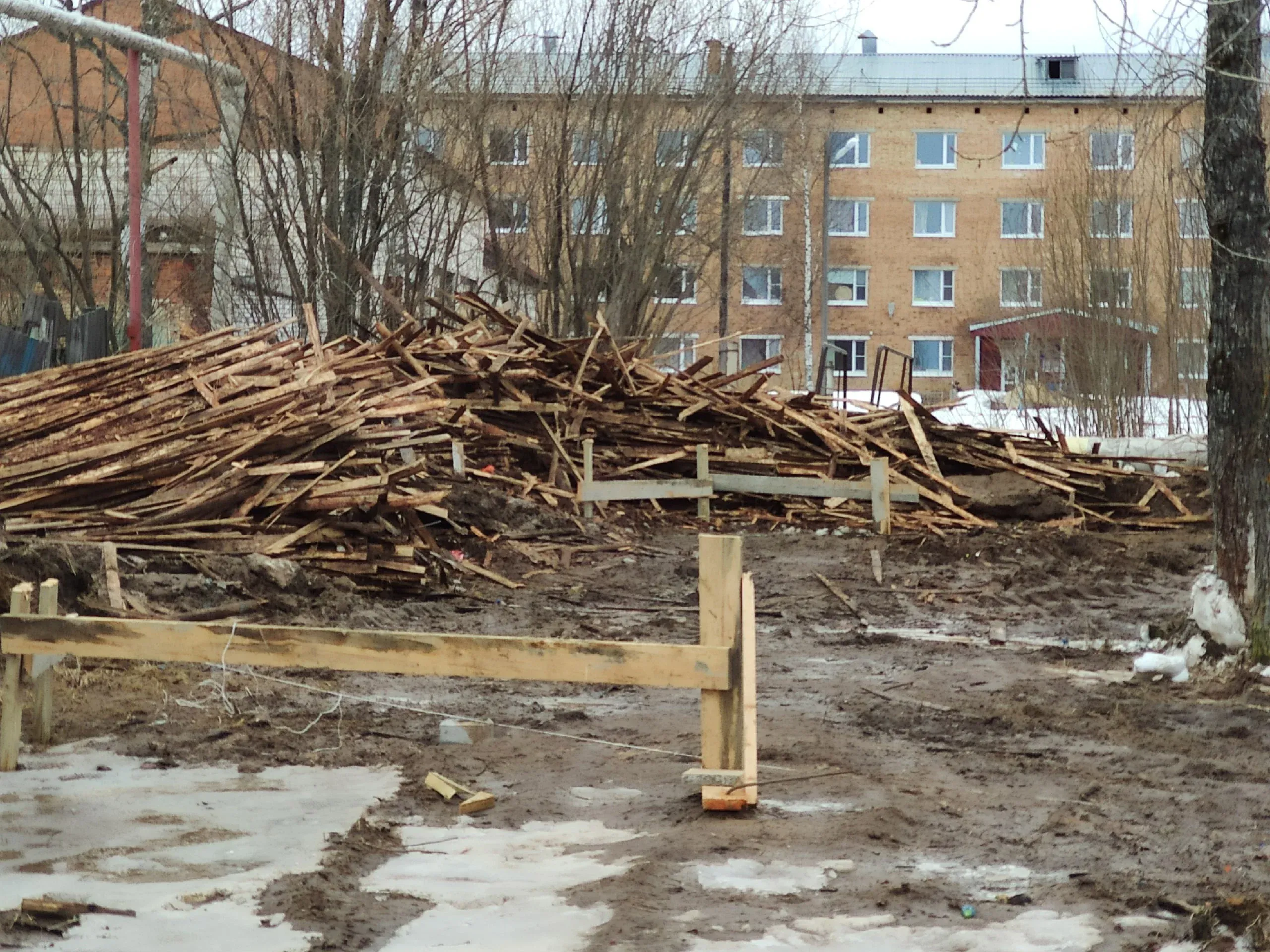 Года 4 назад на этом месте был жилой дом. Дом стал аварийным и его снесли. Долгое время это место пустовало. Там сначала хотели построить новую поликлинику - место в центре поселка - очень бы было удобно. Но потом почему-то оказалось, что эта земля непригодна для этого. Но вот недавно оказалось, что эта земля пригодна для строительства торгового центра. Для поселка, численностью 4 тысячи человек уже хватит с лихвой наших торговых точек.